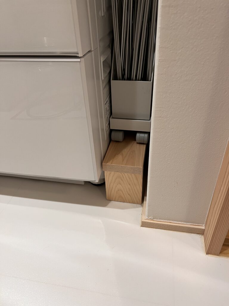 洗濯機横の排水口+ホースの部分に、木の台をかぶせてスペースを確保。