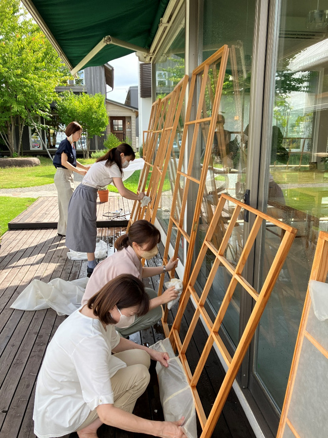ナレッジライフの展示場では秋のしつらえへの衣替えの準備として、スタッフみんなで障子の張り替えを行いました。