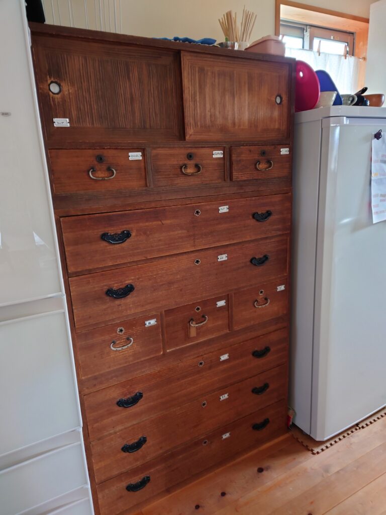 そして、ご実家から持ってきた箪笥を食器棚として活用されていたのが印象的。ラベリングもおしゃれに・・・