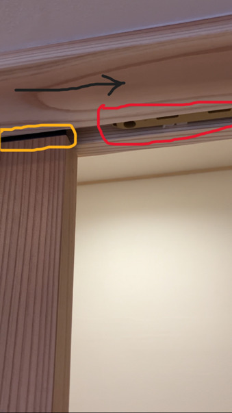 写真赤枠がソフトクローズの部品で、鴨居溝の中に仕込みます。