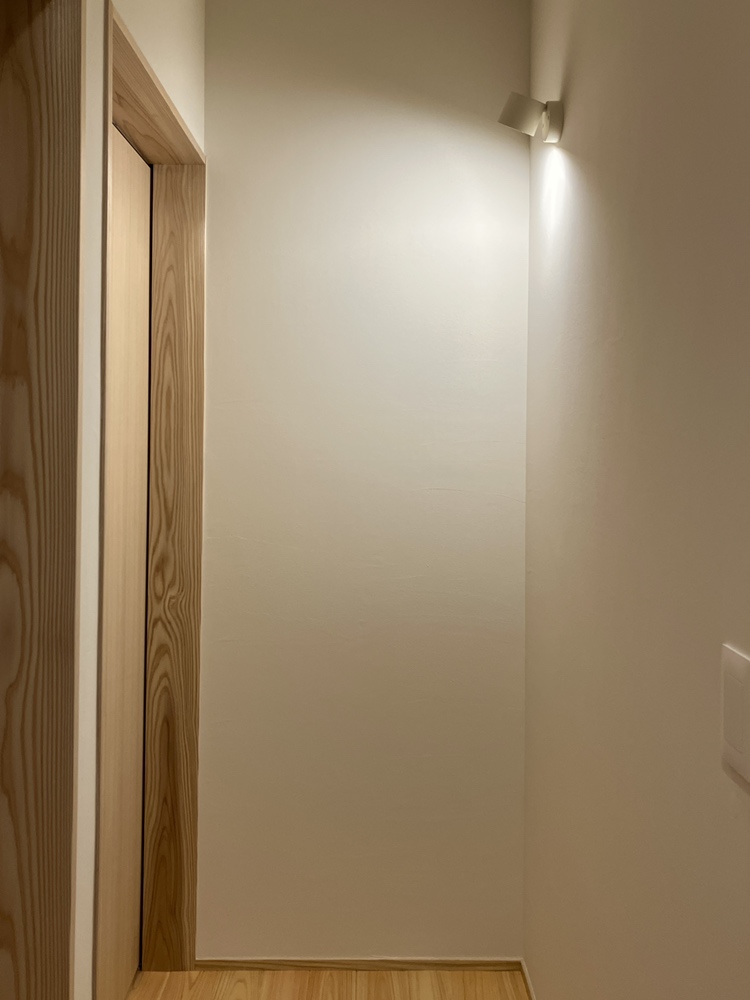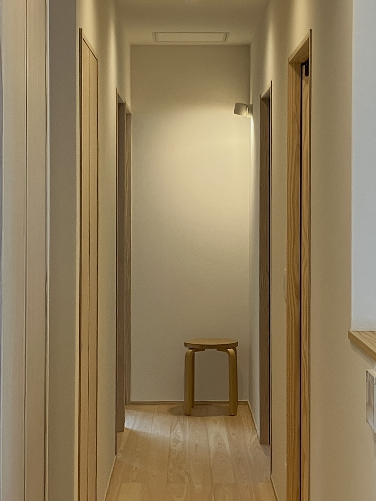 廊下は塗り壁の仕上げを活かして自然な陰影をスポットライトで照らしています。