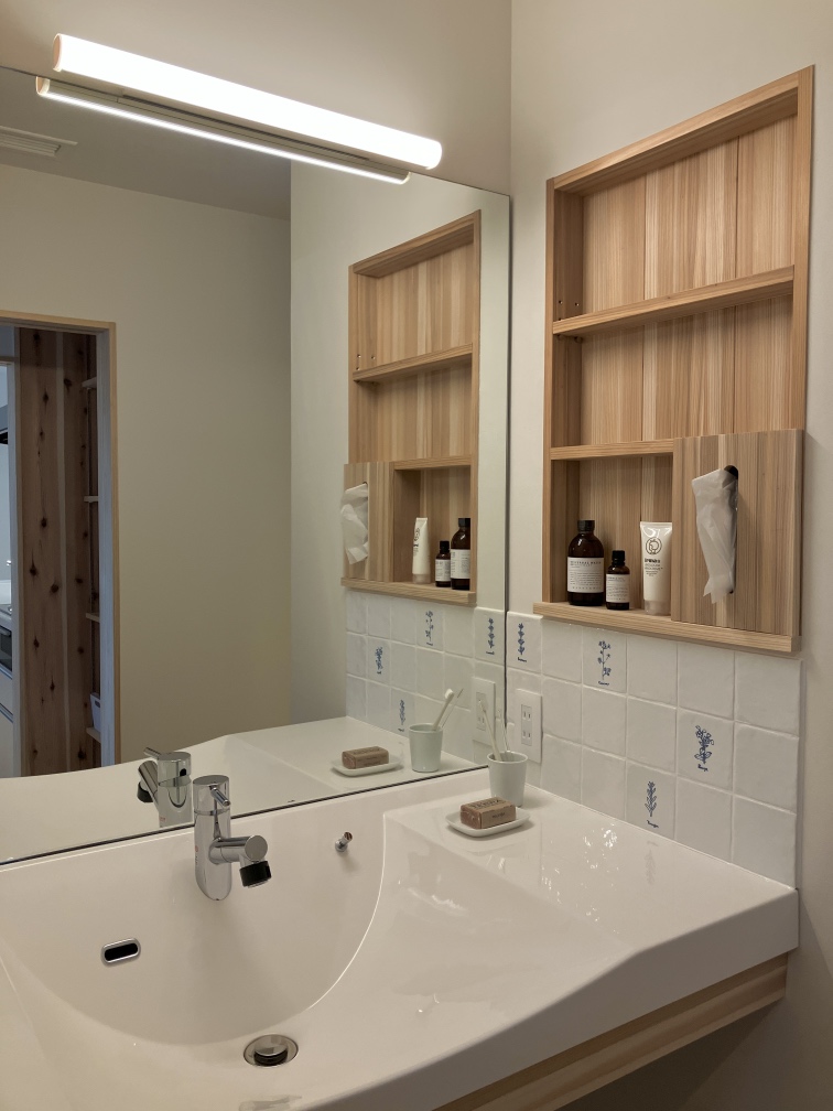 ニッチ収納やタイルなど、奥様の細かいこだわりもたくさん詰まった素敵な洗面台です。