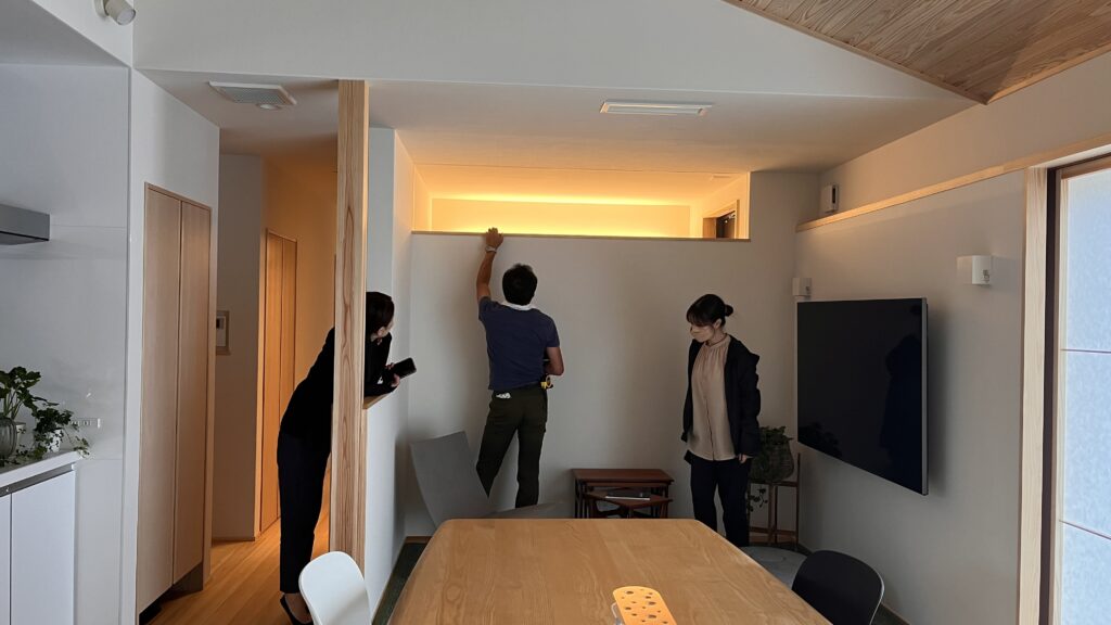 間接照明の光が漏れて天井が繋がることで、玄関とリビングが実際の大きさより広く感じられます。
