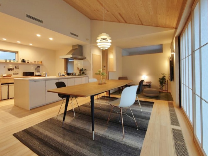 ダイニングを中心に大きめの2m40cmのテーブルをしつらえ。