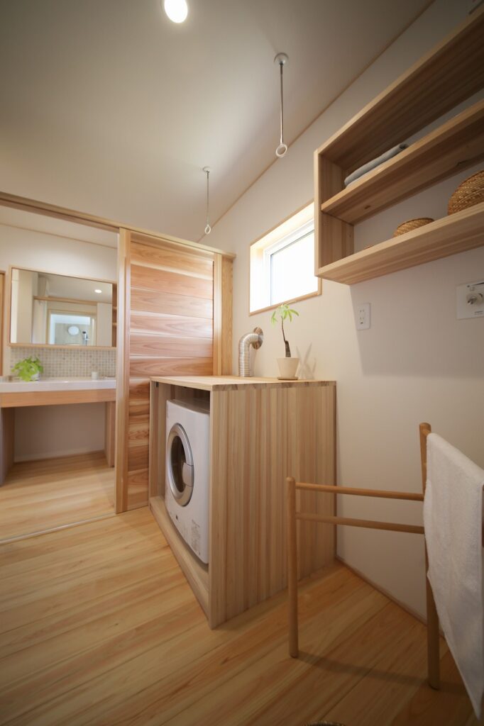 脱衣室の奥、いちばん日当たりのいい場所に洗濯機と物干スペースを作ったお宅。