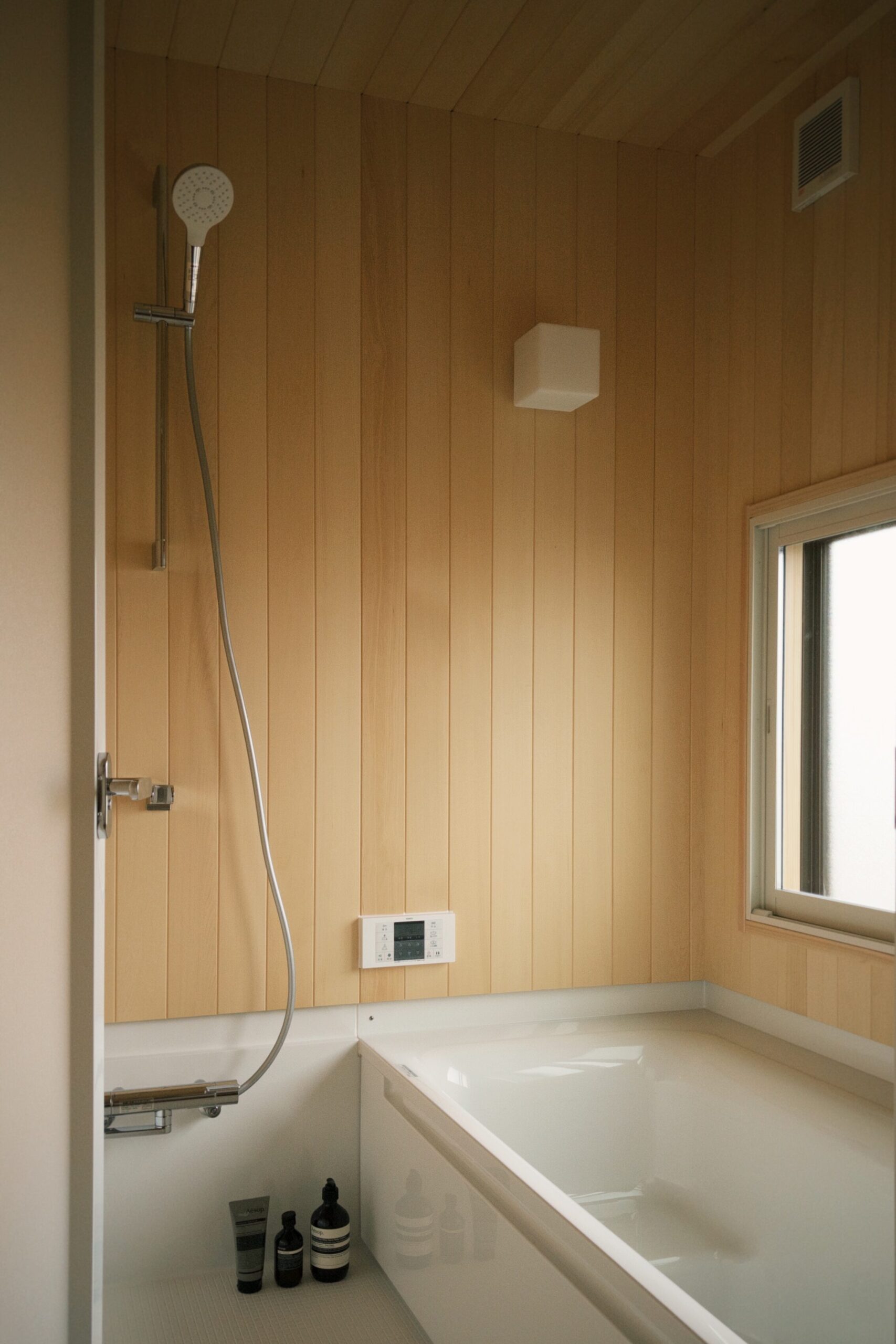 ユニットバスはハーフユニットに入替え、壁にヒバを貼りました。