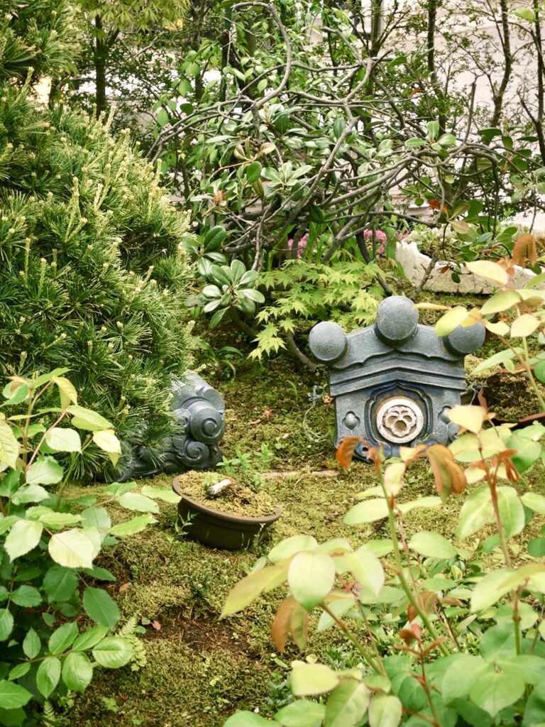 解体時に屋根から下した鬼瓦がお庭に!