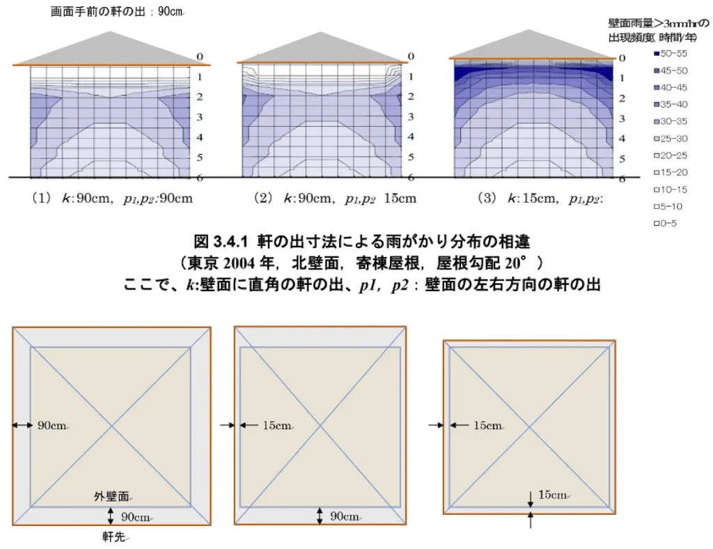 下記の図は軒の出の違いで どれだけ外壁に雨がかかるかを比較したものです