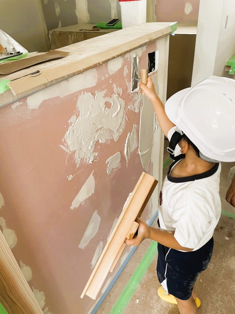 左官職人のお兄さんに教えてもらっている後ろ姿がかわいい・・・
