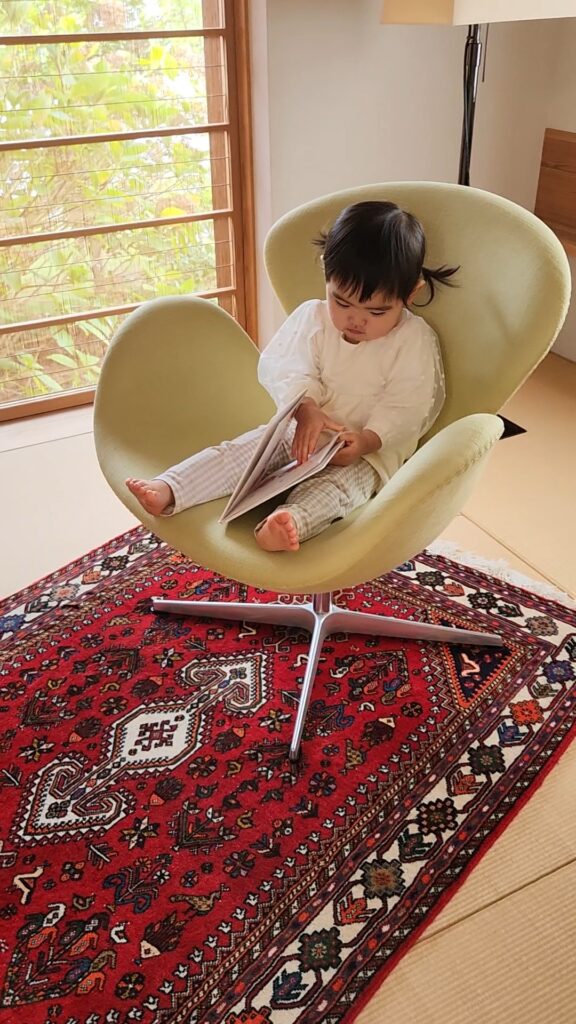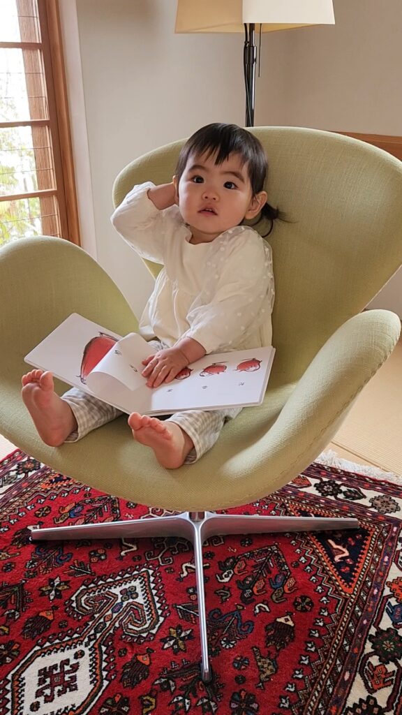 いっちょ前にいいところを見つけ、座って絵本を読んでいると、、、