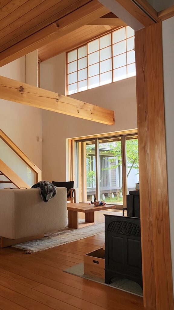 天井の低い和室から吹き抜けへ、視界がひらける開放感があります。