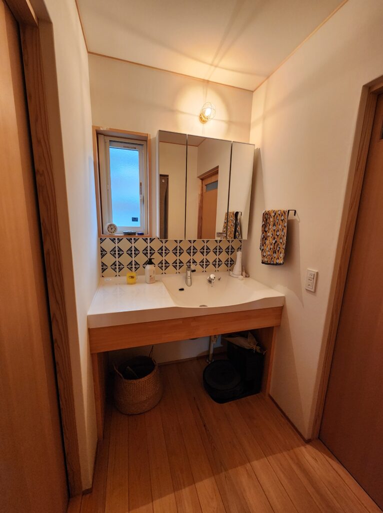 こちらはメキシカンタイルがアクセントの造作洗面。