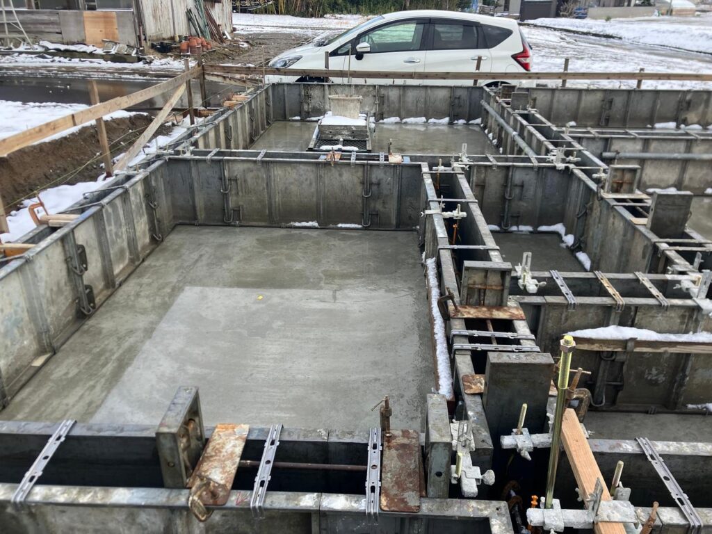 底盤部分のコンクリート打設が完了し、鉄筋が配置されていた両側に型枠を組んでいきます。