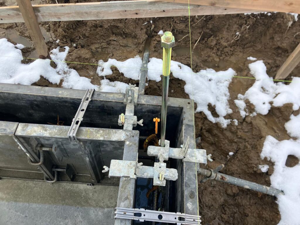 底盤部分のコンクリート打設が完了し、鉄筋が配置されていた両側に型枠を組んでいきます。