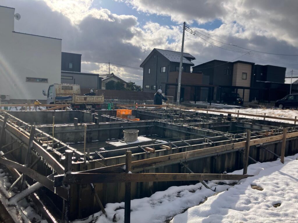 検査が終わると、ベース(基礎の底盤部分)にコンクリートを流していきます。