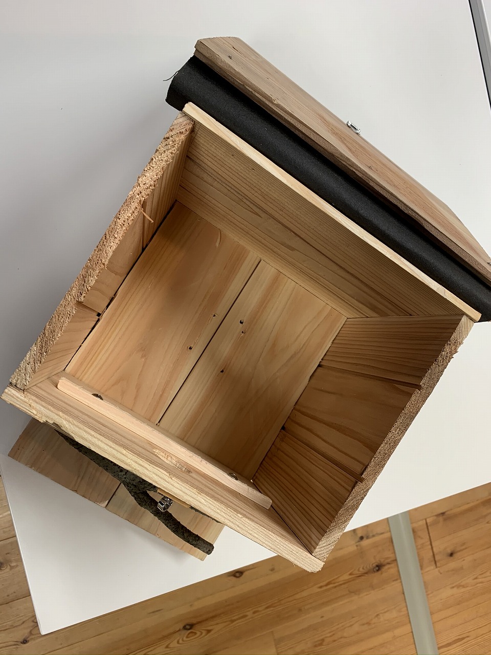 アスファルトルーフィングの廃材も使っていますよ。「廃材巣箱」ですね。