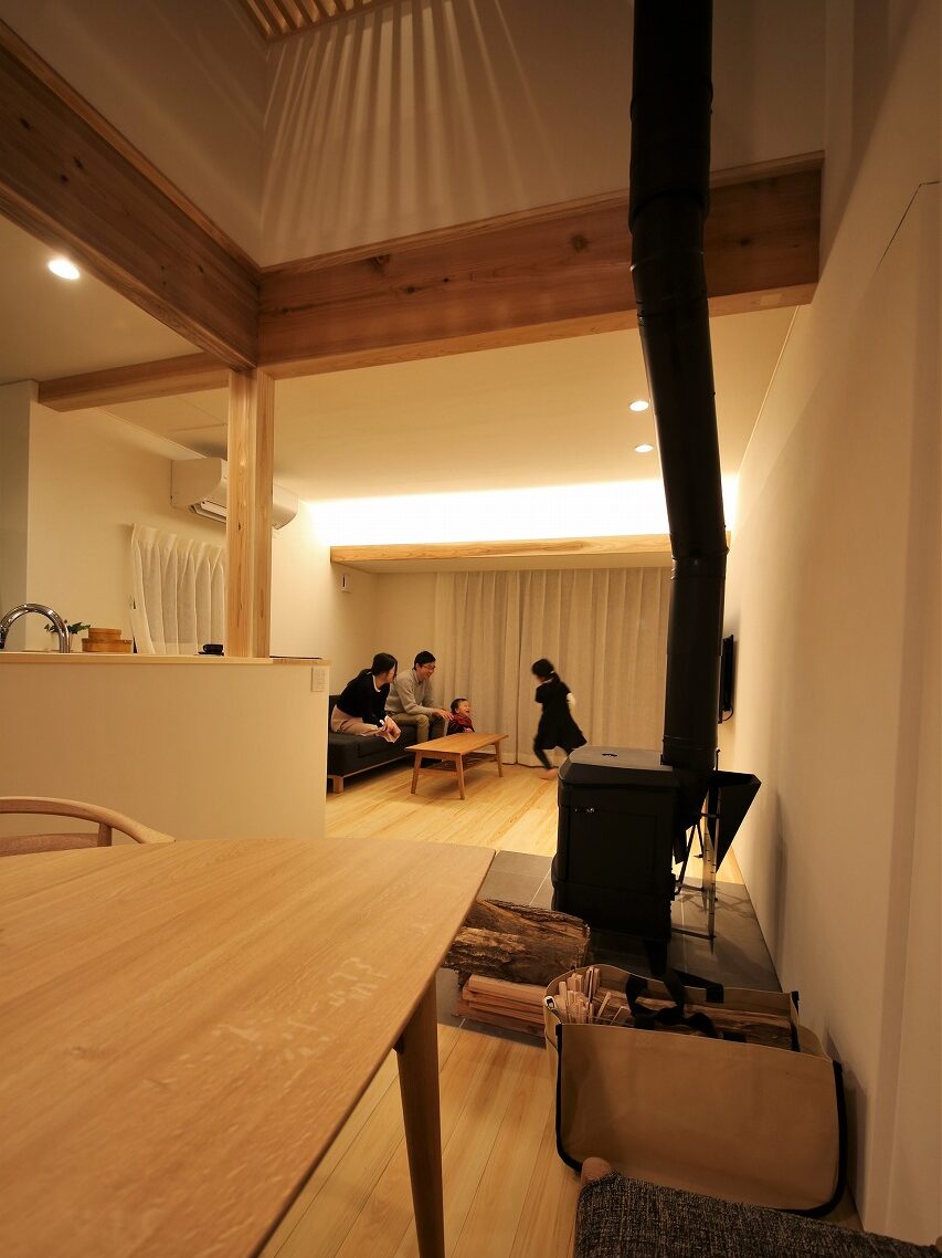 家の真ん中で家族を見守る薪ストーブが特長のこちらのお家。