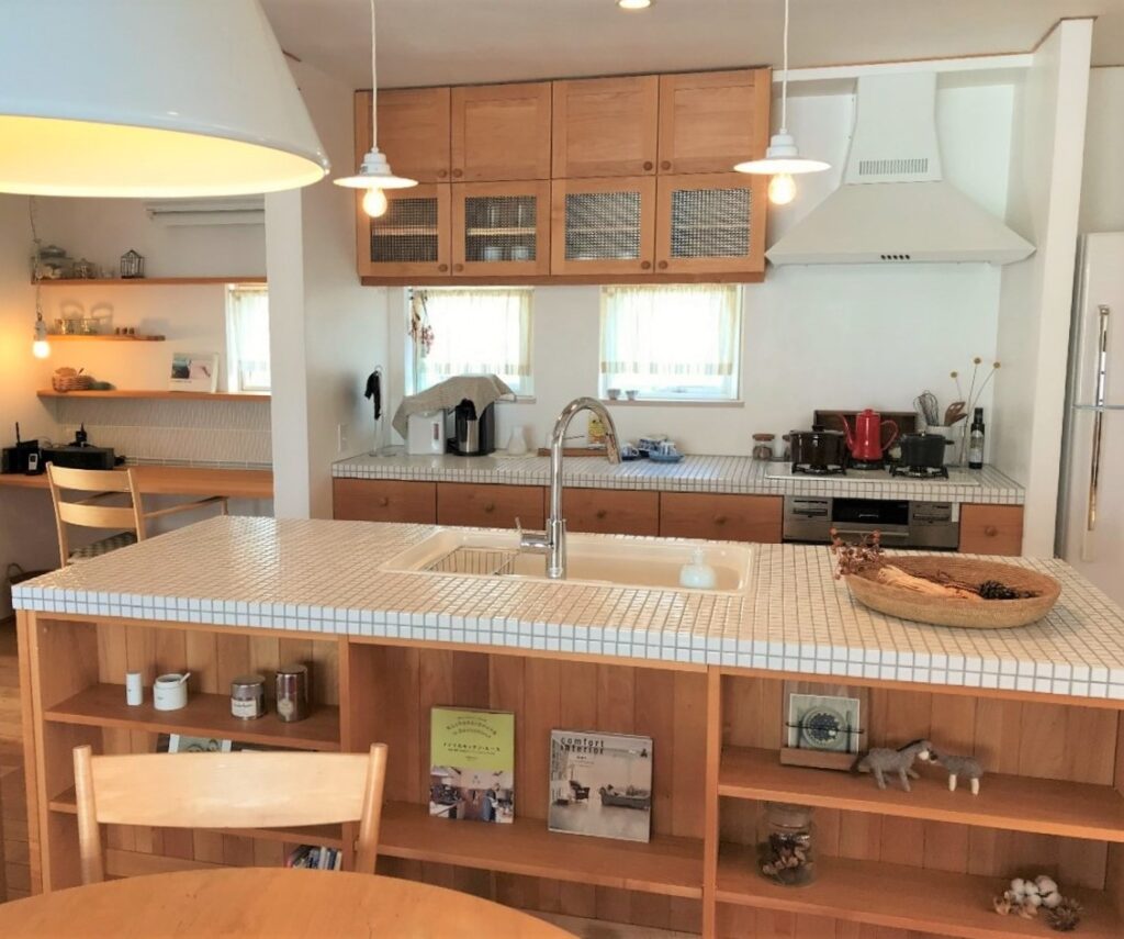 キッチンのカウンターはモザイクタイル貼り。ワーキングカウンター前の壁にもタイルでアクセントを。