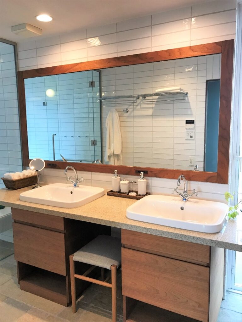 浴室・脱衣室の壁・洗面化粧台前の鏡周りにタイルを使用。大判サイズのタイルは重厚感がでます。