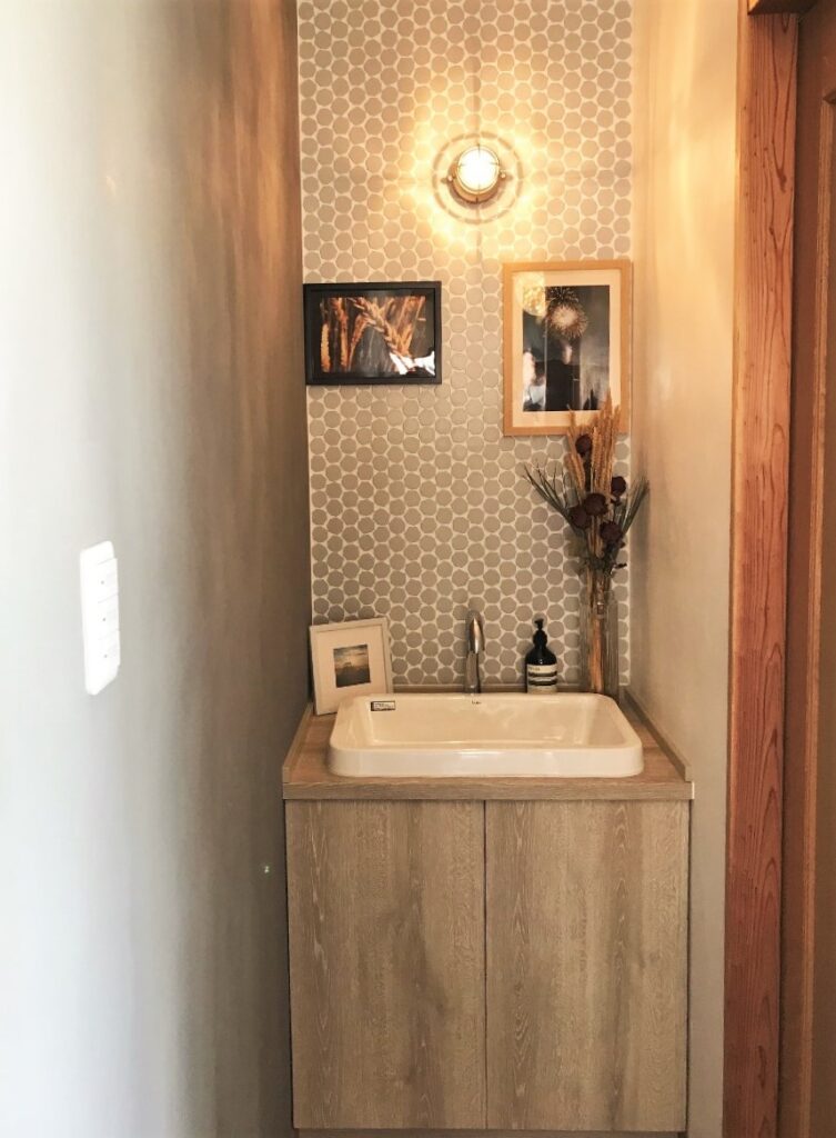 トイレ手洗いの周辺をモザイクタイルでガードしつつインテリアのアクセントに。こんな風にトイレの中なら気軽に雰囲気づくりができておススメですよ。