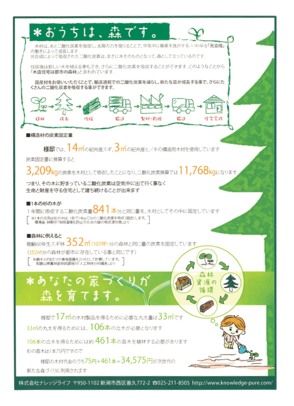 建築頂いたお施主様に、国産木材を使うことが環境保全へ貢献していることをお伝えし、その家で使った国産木材の数量/CO2削減量/炭素固定量、植林など森林保全への貢献度を、解説と本数や量などの数値化した証明書を発行し、お引渡し時にお渡ししています。