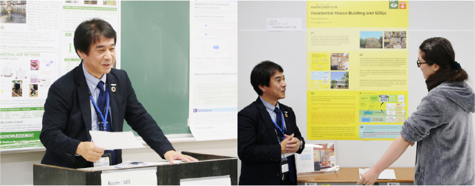 国内外の高等専門学校(高専)、大学、研究機関、企業等と連携し、技術科学イノベーション及び海外拠点と連携した教育研究を推進する取組みということもあり、海外の研究者の方々の講演をはじめ、長岡技術科学大学の学生の皆様や全国各地の高専の学生の皆様がSDGsの実現に向けた研究成果をプレゼンテーション。共通言語も英語で発表するという国際的なイベントです。学生の皆様だけではなく、SDGsに取組む民間企業も参加可能になったということで、弊社もご案内を頂き参加させて頂きました。弊社が家づくりを通して行なっているSDGsの実現に向けての取組みを、代表の中村によるスピーチとポスターセッションでプレゼンテーションを行ないました。