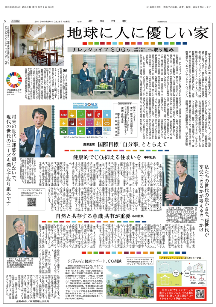 ナレッジライフSDGsへの取組みを、新潟日報社代表取締役社長|小田敏三様と株式会社ビジネスコンサルタント|ESB本部、探索・事業開発グループ主席|廣瀬沙織様と弊社代表の中村による対談形式で考える企画記事が、2019/10/26|新潟日報朝刊にて掲載されました。