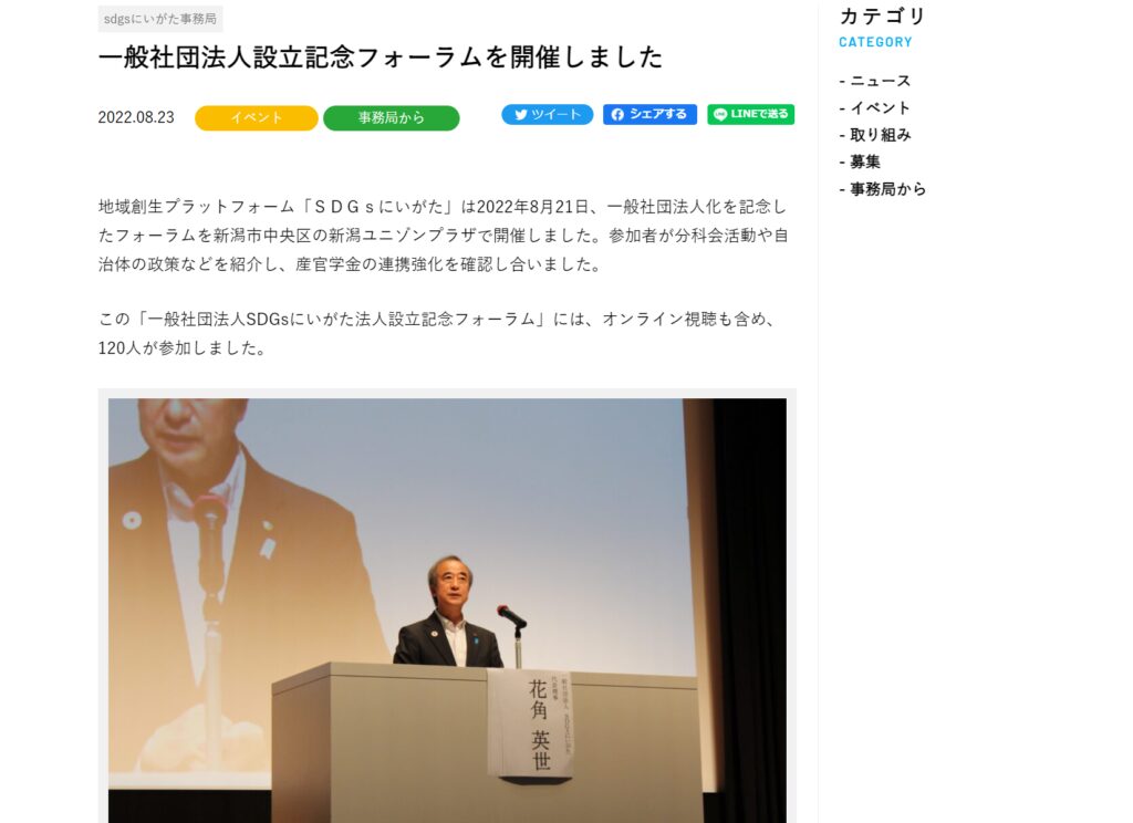 地域創生プラットフォーム「SDGsにいがた」は2022年7月1日に、一般社団法人化となり、それを記念したフォーラムも開催されました。代表理事を務める花角新潟県知事をはじめ、参加者が分科会活動や自治体の政策などを紹介し、産官学金の連携強化を確認し合いました。