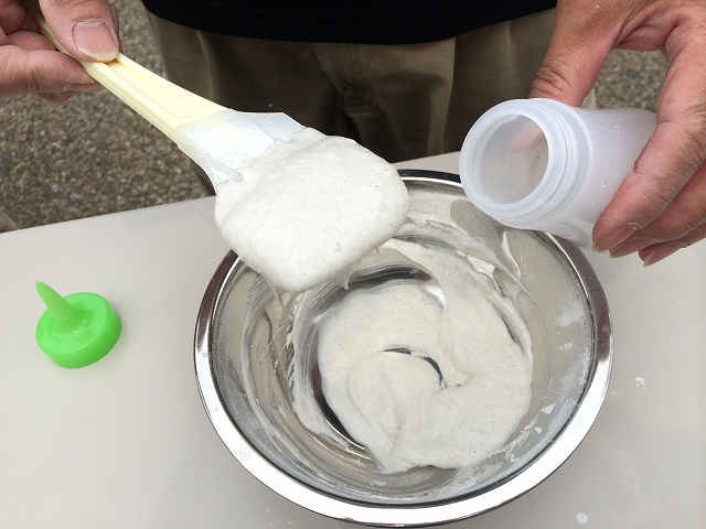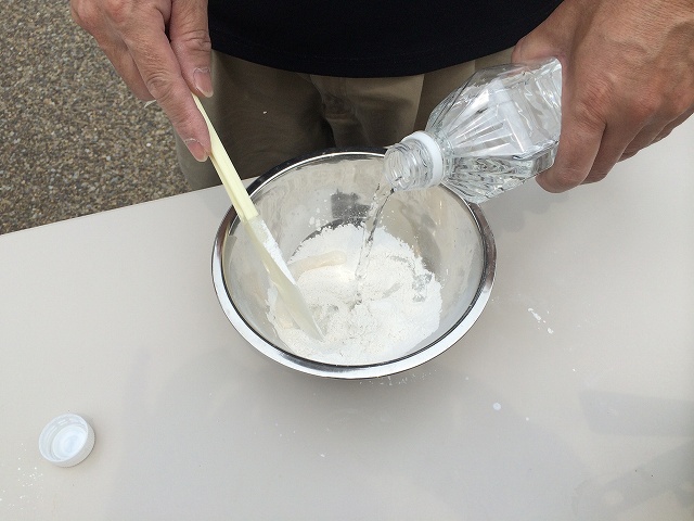 ①ピュアウォールをふるいにかけ水を入れてゴムべらで混ぜる