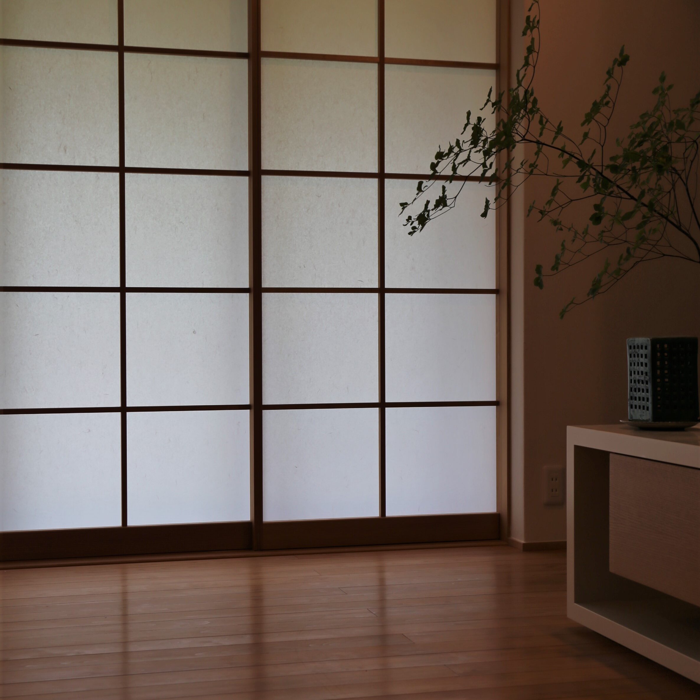 ソファを置かずに床で過ごすスタイルで、障子の建具や無垢の床が引き立っています