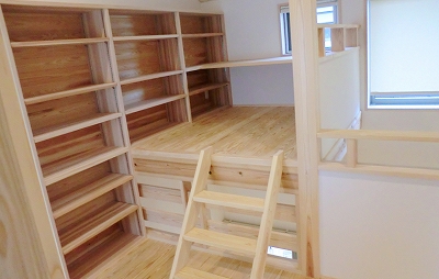 吹き抜け部分の半分を床から1段あげて、ロフトのようにしました。