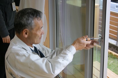 最後に、リビングからデッキにつながる掃出し窓の重さを調節して、今回の点検は終了です。