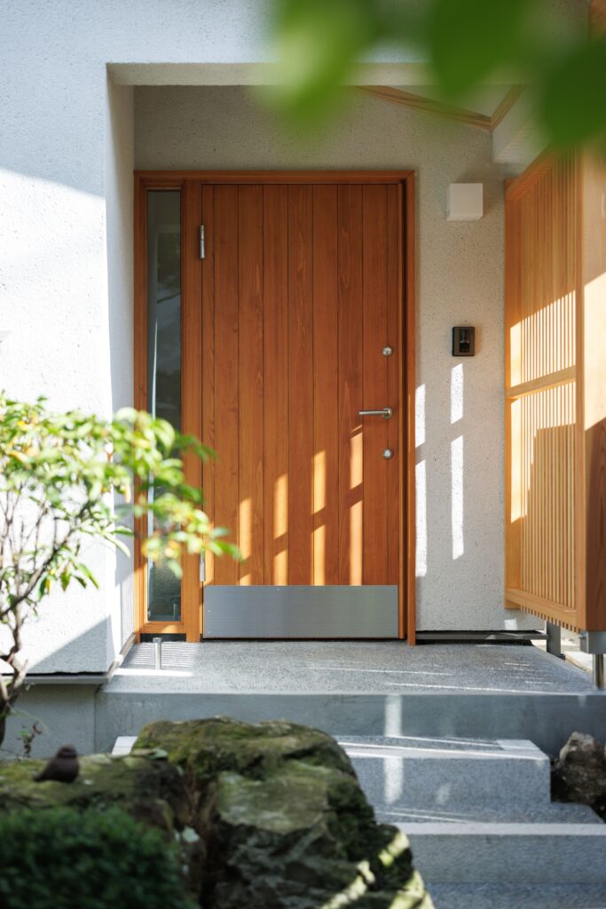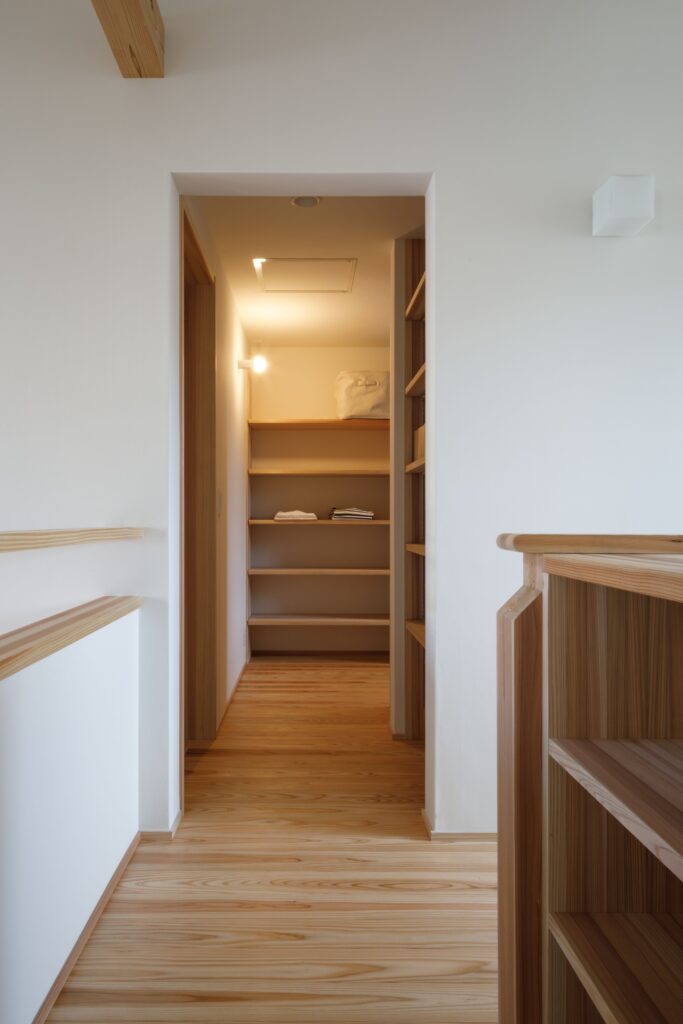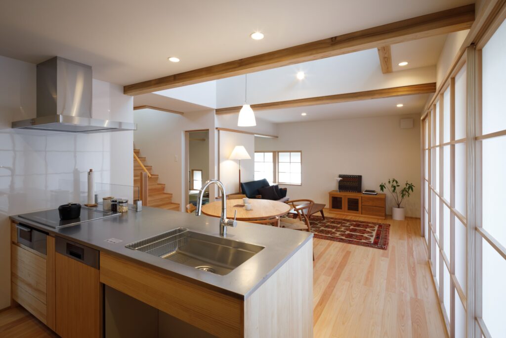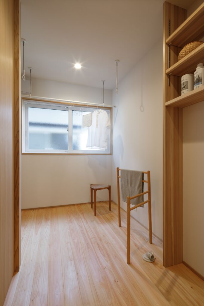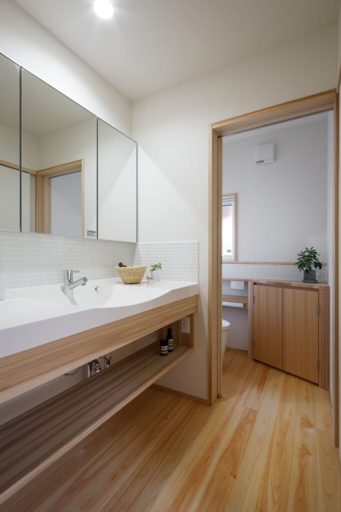 ナレッジライフのモデルハウス「北山の家」を気に入ってくださったお施主様の住まいです。心地よい場所がつながる間取りはほとんどそのままに、ご家族の暮らしに合わせて設備や収納をつくっていきました。玄関からすぐの”ただいま手洗い”ができる水回りや、家事の時短を叶える動線は時代に合わせた工夫のひとつ。
