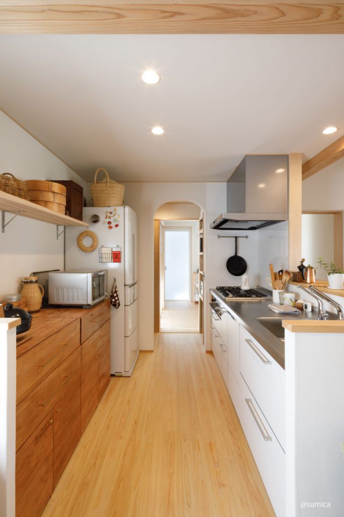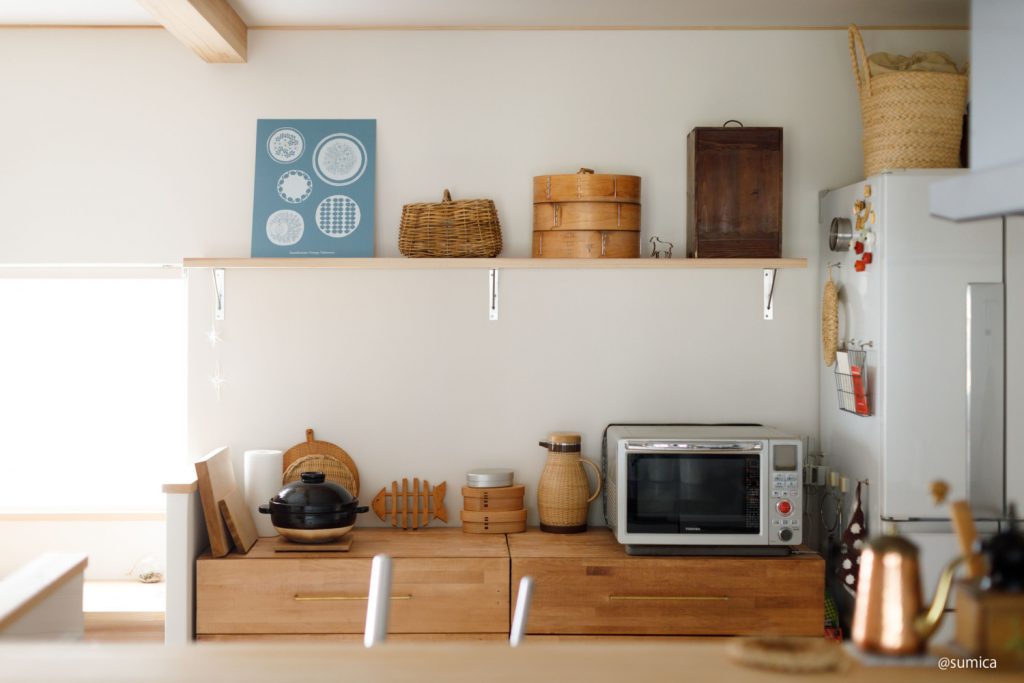 日本らしい暮らしの道具が並ぶキッチン。自然の素材でつくられたものや昔ながらの道具が、木の家によく馴染んでいます。