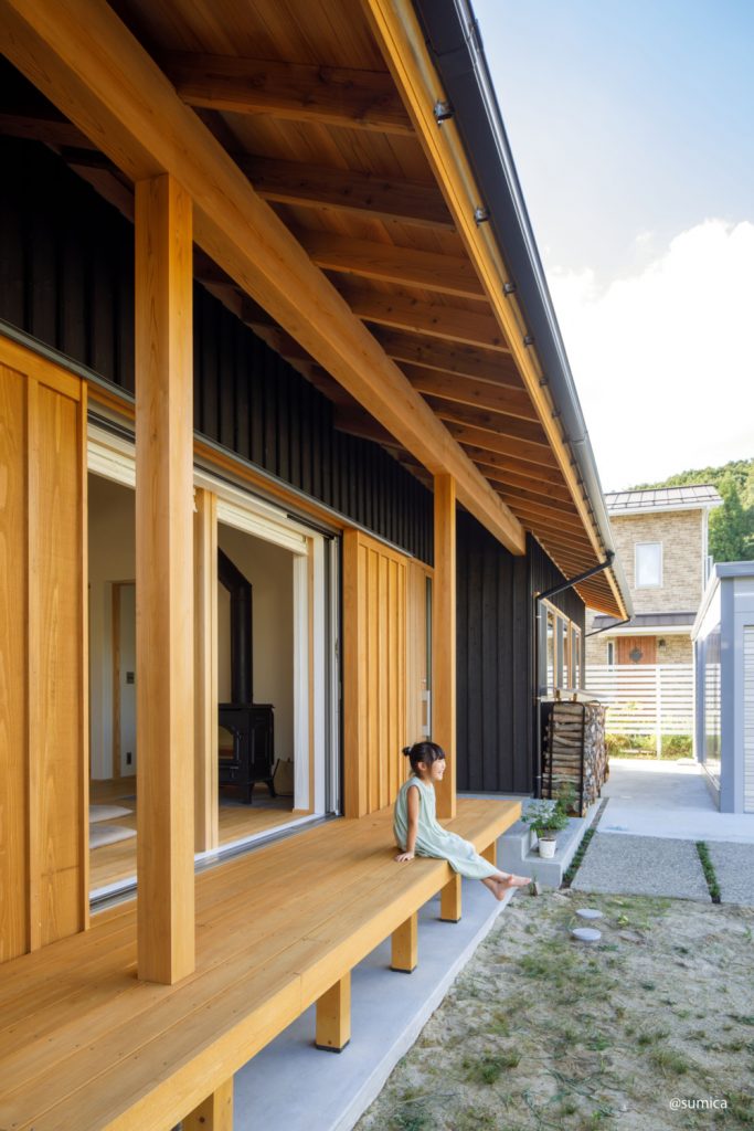 リビングの全開口サッシを引き込むと、大きな軒のかかったウッドデッキもくつろぎの場に。