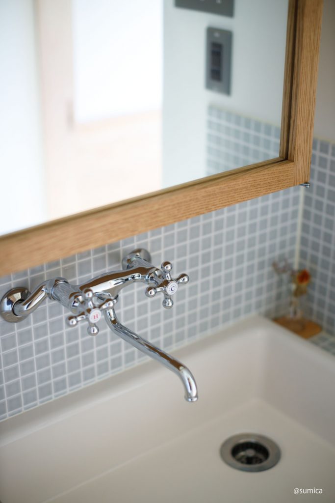 レトロな水栓やモザイクタイルにお施主様のこだわりが詰まった造作洗面台。