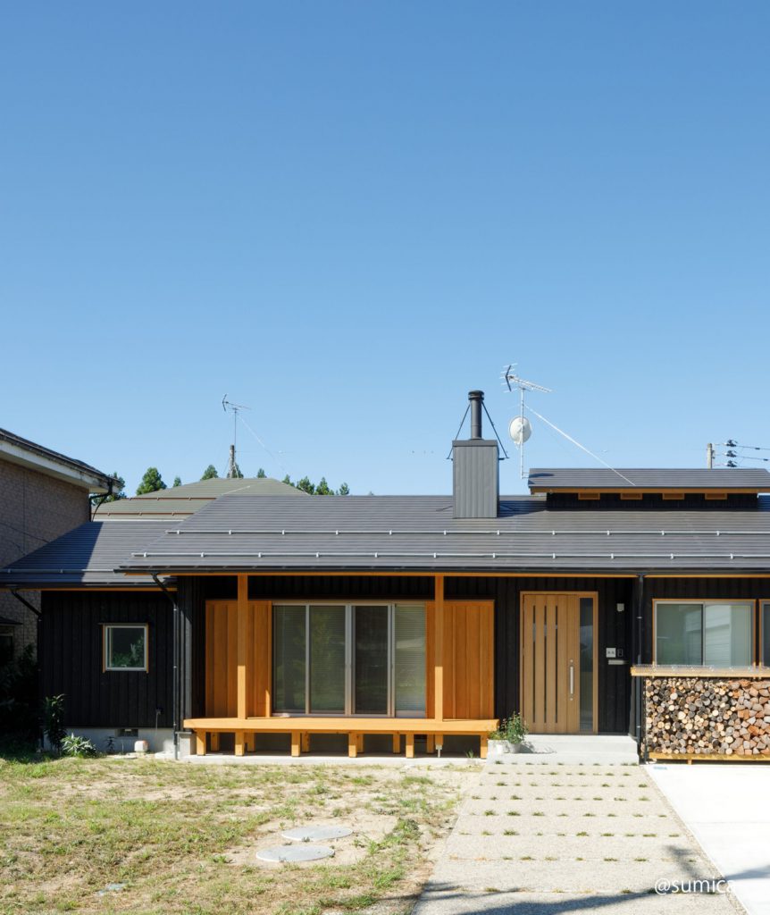 青空と緑に映える平屋の佇まい。DIYが好きなご家族へ、メンテナンスを楽しめる焼杉の外壁を提案しました。