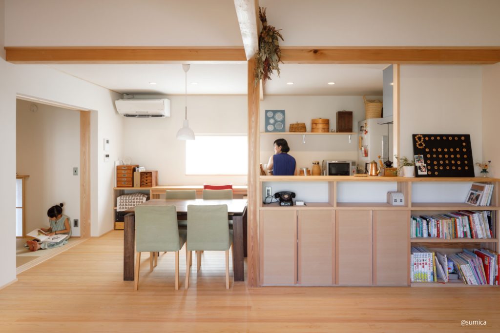 リビングダイニングキッチン+和室が間仕切りなくつながる間取り。自然光が家の隅まで届きます。