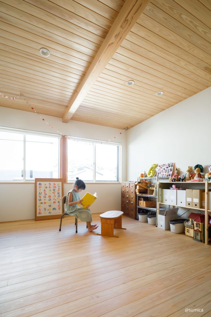 広々とプレイルームのような子供部屋。平屋なので、リビングにおもちゃを持っていくのも片付けるのも簡単。