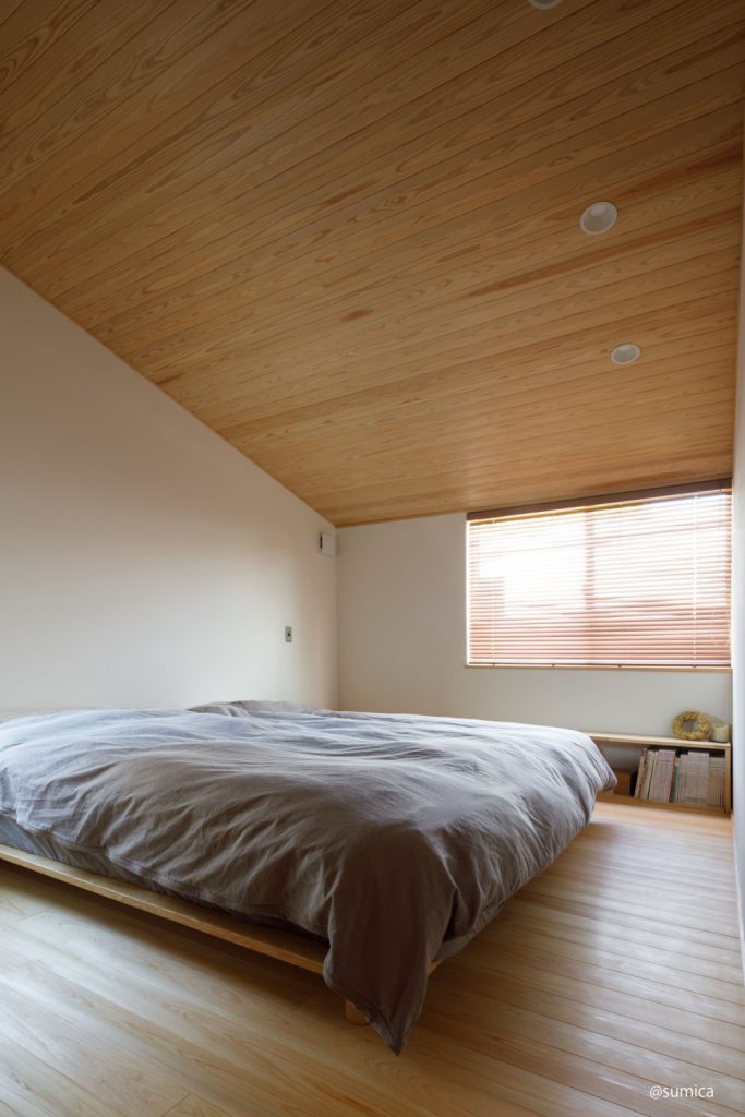 寝室は余計なものを置かずシンプルに。板張りの勾配天井が落ち着きある空気を漂わせます。窓際の本棚はご主人のDIY。木の家での暮らしを楽しんでいらっしゃいます。