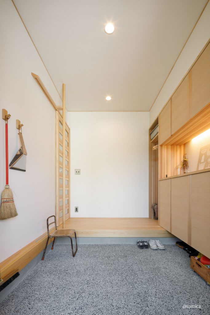 豆砂利の洗い出し土間に、レトロな道具たちが良く似合う玄関。丁寧に暮らしているのが伝わってきます。