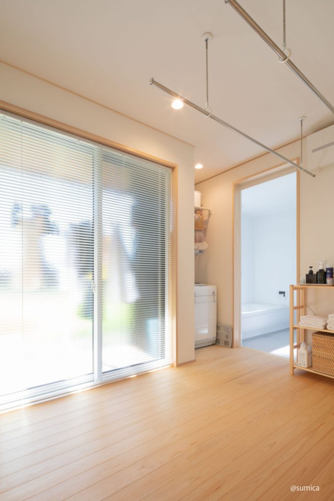 物干し室は室内干しにも十分な広さ。掃き出し窓から出られる外干し用のデッキも備えました。