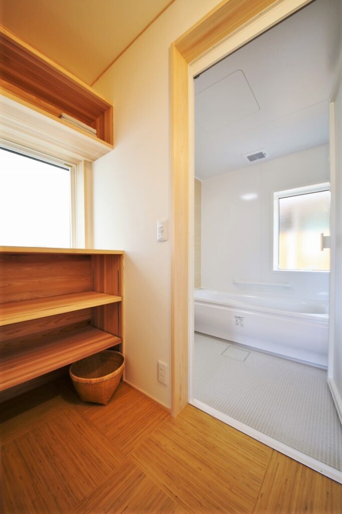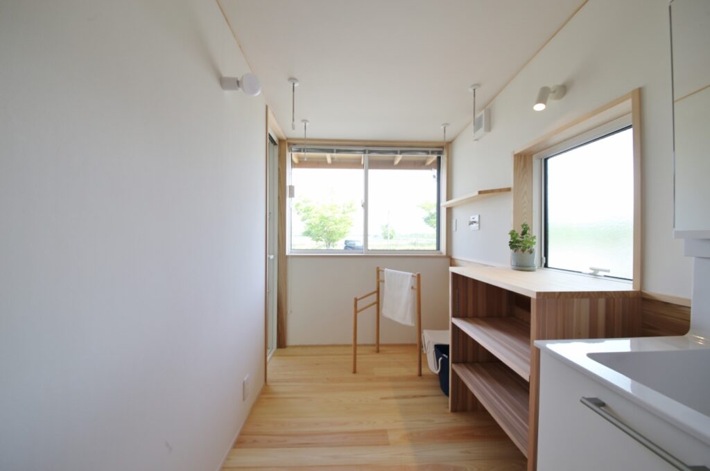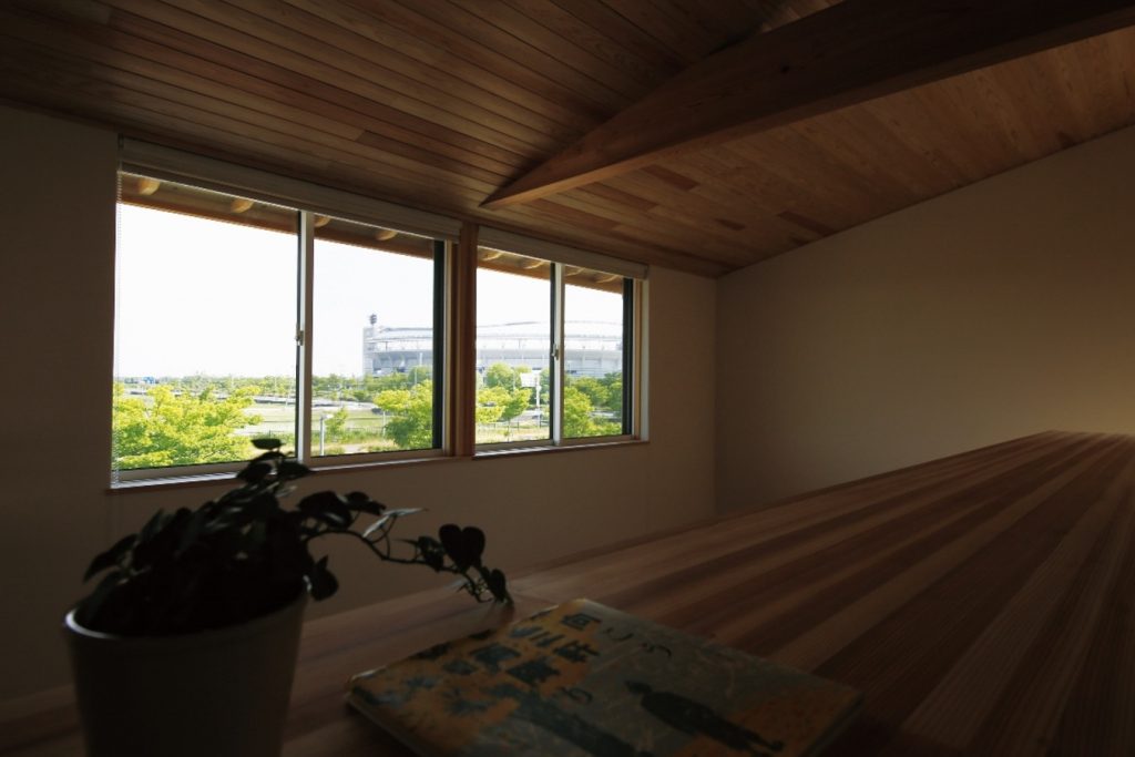 市街地に住んでいても自然をすぐそこに感じることができる新潟。新潟市のシンボルのような競技場と、目の前に広がる田園風景を存分に取り込むことができる抜群の立地を生かしたプランです。周りに景色を遮るものはありませんが、1本道を挟んだ先は主要な幹線道路ということもあり、開口部には植栽でゆるやかに目隠しを。リビングや水回りに適材適所の造作収納を設けたことで、すっきりとシンプルに新潟らしい環境を楽しみながら暮らせる住まいになりました。