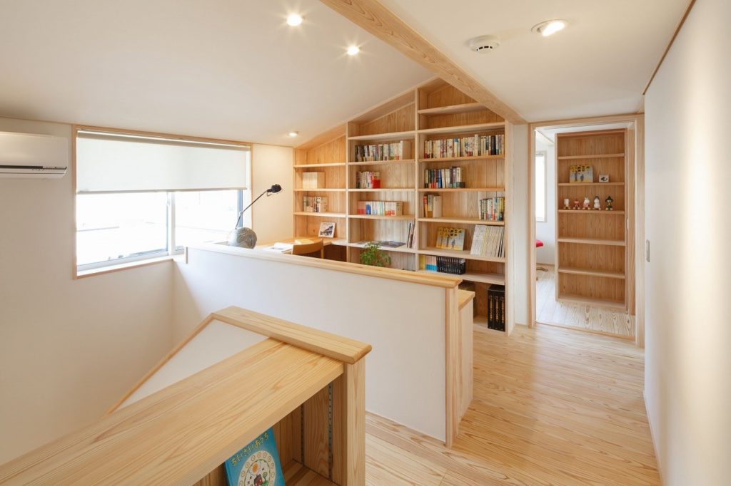 2階のホール、手元に自然光が入る一角に設けた書斎コーナー。図書館のような本棚は、家で過ごす時間を豊かなものにしてくれますね。