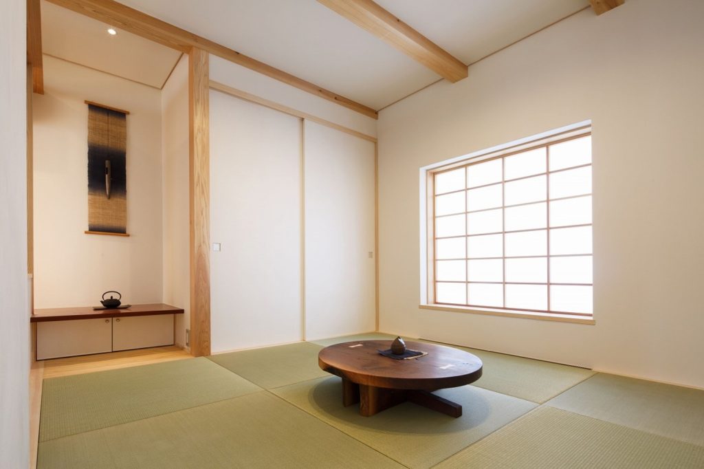 和紙を使った障子とペンダント照明を通した光が、やわらかい空間をつくり出します。桟・框・組子の太さを統一し、閉めると一枚のように見える”吉村障子”を採用。