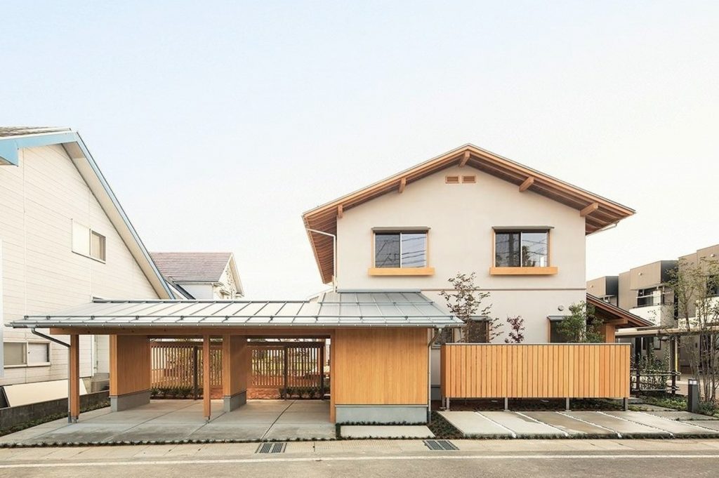 ビルトインガレージが一体になったのびやかな外観は、板塀や植栽も相まって上品な美しさ。