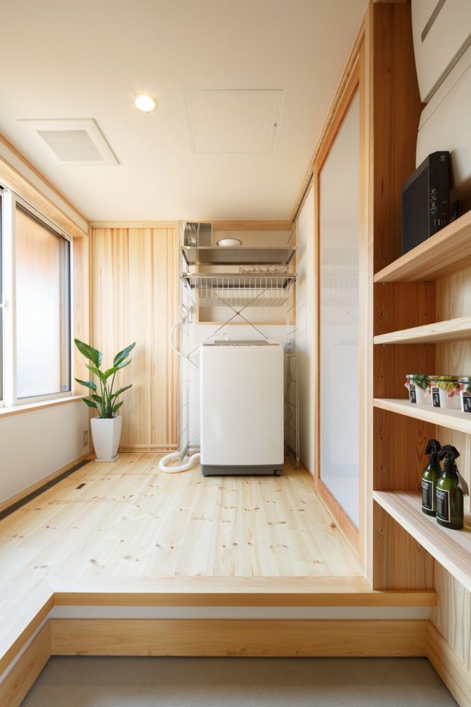 洗濯スペース 兼 勝手口は洗面とキッチンから程近く、家事効率も抜群。勝手口はビルトインガレージにアクセスできるので、沢山買い物をした時にも助かる動線です。