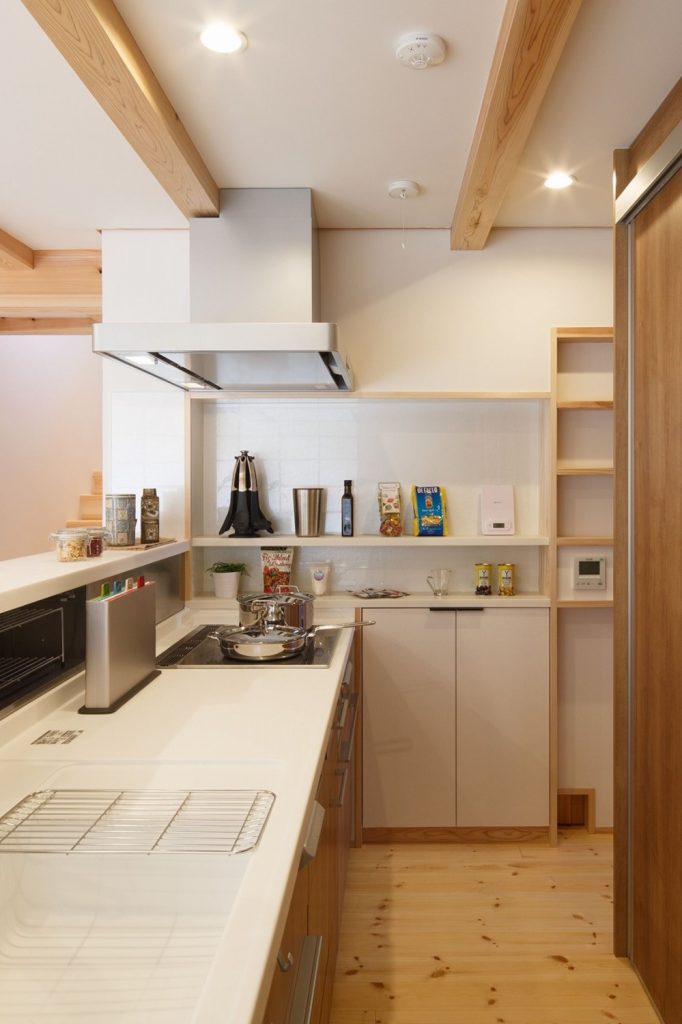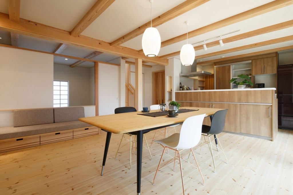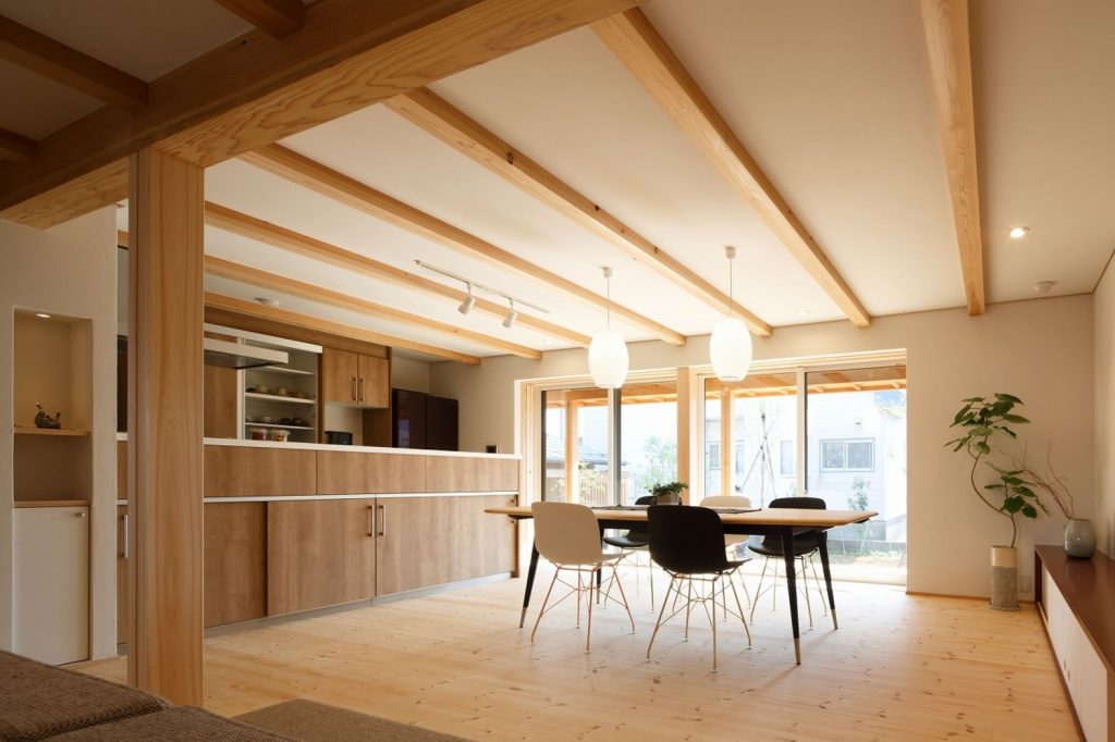 雪が多く寒さも厳しい気候の新潟で快適に暮らせる工夫が詰まった木の家。建物と屋根続きのビルトインガレージは、勝手口にアクセスできて悪天候の日や荷物が多い日も安心。暖房は足元からじんわりと暖まる土間暖房システムで、家中の温度差を少なく快適に。無垢の床や造作のソファ、障子の建具など心豊かに暮らせる要素が詰まった住まいです。