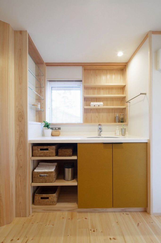 山吹色の和紙貼り扉がアクセントになった洗面。使い方や収納量、デザインを好みに応じてつくれるのは、造作洗面のメリットです。