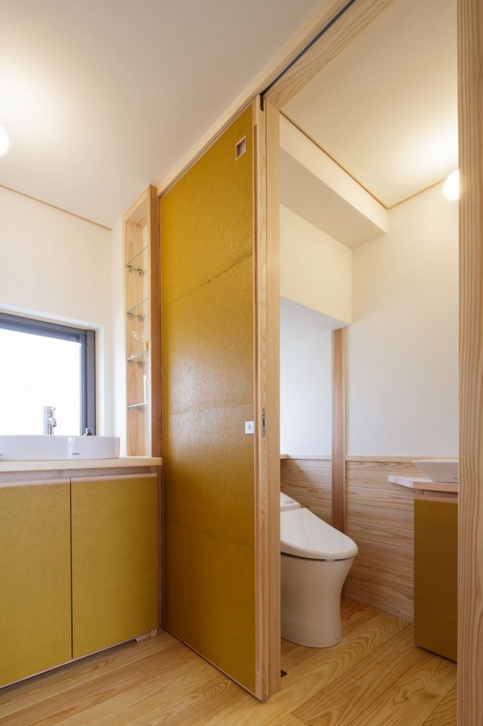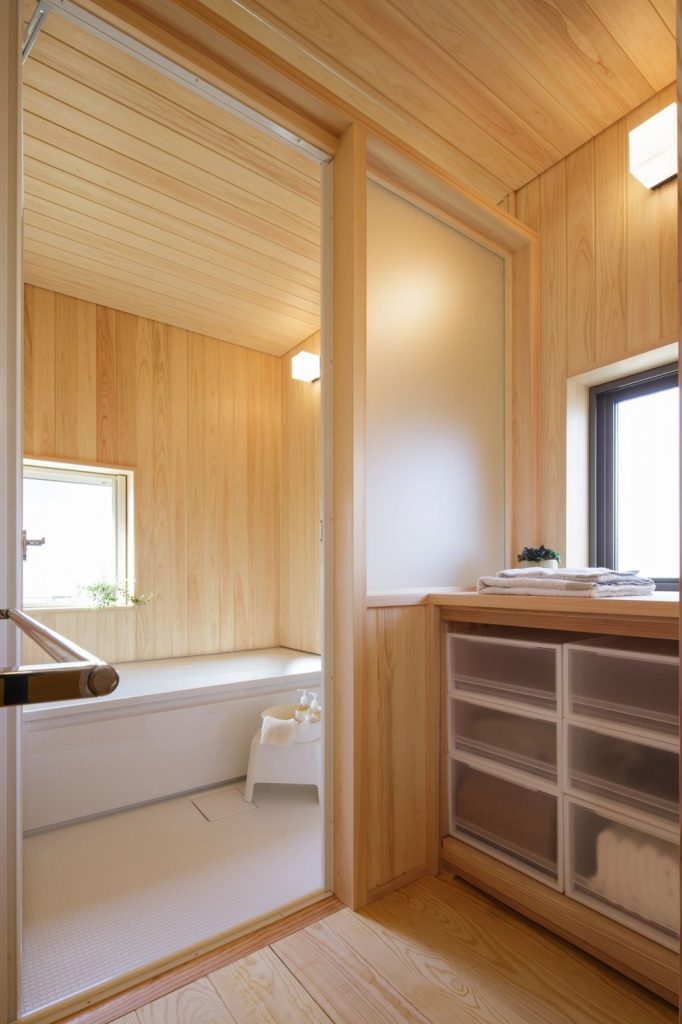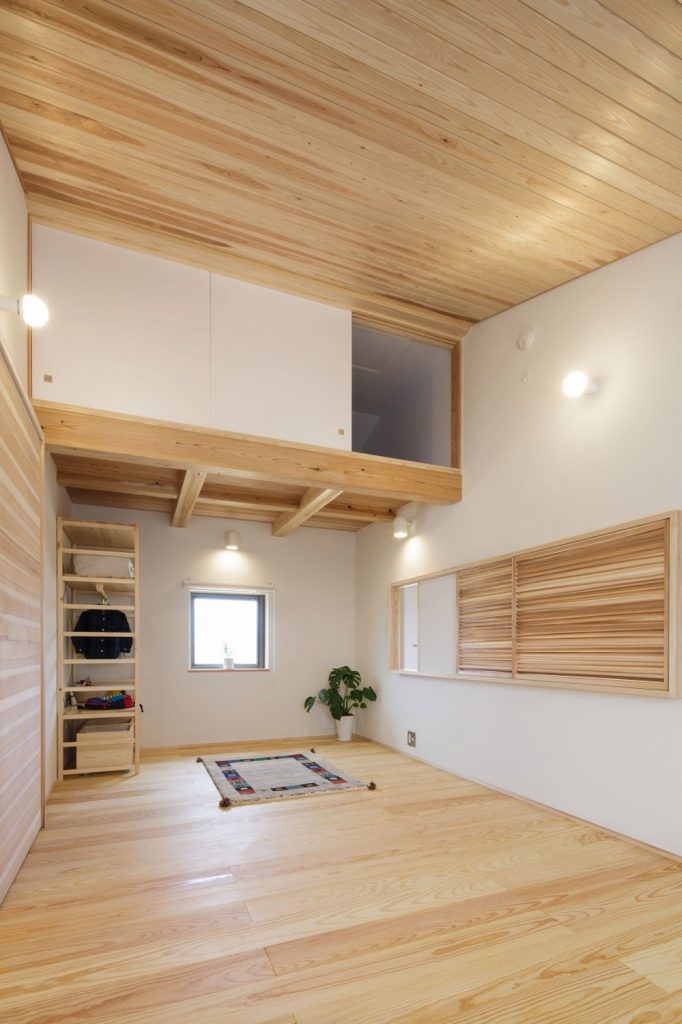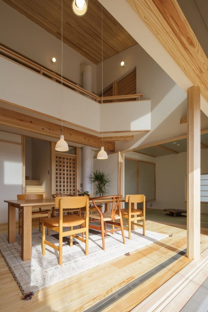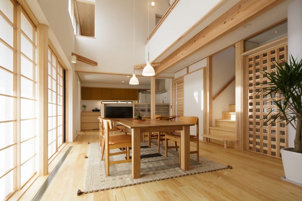 大きな吹き抜けの下、家の真ん中にリビングダイニングを配置。リビングとダイニングを兼用の空間にし、外と繋がる開口部を設けたことで、30坪以上の広がりを感じられる「小さくつくって広く住む」木の家です。広い吹き抜け空間を設けながらも、全館空調システムのおかげで均一な室内環境を実現しました。また、キッチンや洗面、和室などの木部・和紙のあしらいも注目ポイント。日本らしさを残しつつ、シンプルで飽きのこないデザインに仕上げています。